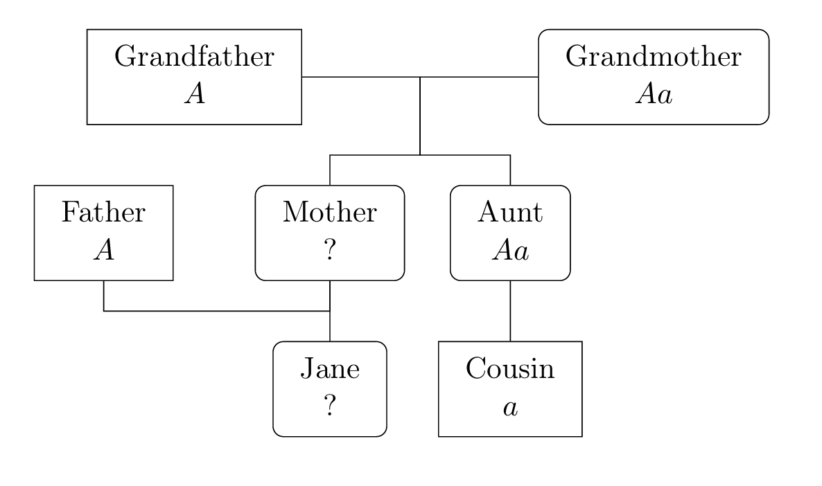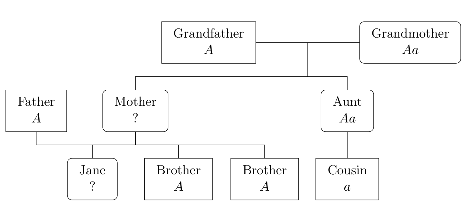 Your cells contain 23 pairs of chromosomes, each containing many genes (while 23 pairs is specific to humans the idea is similar for all animals and plants). The genes take different forms called alleles and this is one reason why people differ (there are also environmental factors). Of the 23 pairs of chromosomes, 22 pairs are homologous (each of the pair has an allele for any gene located on this pair). People with different alleles are grouped by visible characteristics into phenotypes; often one allele, \(A\) say, is dominant and another, \(a\), is recessive in which case \(AA\) and \(Aa\) are of the same phenotype while \(aa\) is distinct. Sometimes, the recessive gene is rare and the corresponding phenotype is harmful, for example haemophilia or sickle-cell anaemia.