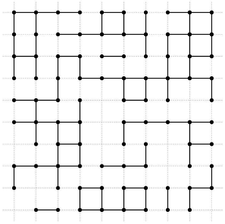 The picture shows part of a percolation configuration, with open sites indicated by black dots and edges between open sites indicated by unbroken lines.