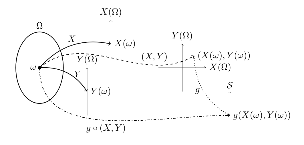 Formally, \(g(X,Y):= g\circ (X,Y)\), or in more specific terms, the random variable \(g(X,Y):\Omega\to\mathcal{S}\) is defined by: \[g(X,Y)(\omega):= g(X(\omega),Y(\omega))\text{ for all }\omega\in\Omega.\] For example: \[\pr{ g(X,Y)\in A } = \pr{ \{\omega\in\Omega: g(X(\omega),Y(\omega))\in A\} } \text{ for all } A\subseteq\mathcal{S}.\]