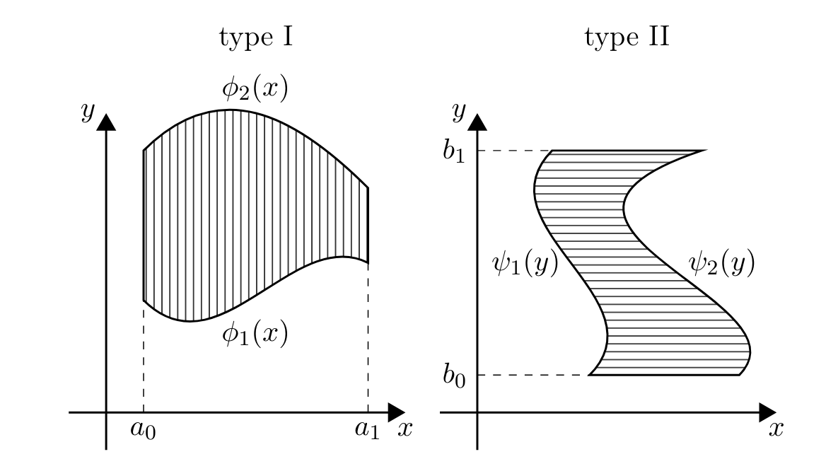 As before, the joint probability density function \(f(x,y)\) determines the joint probability \(\pr{(X,Y)\in A}\) for most events \(A\). More precisely, remember the definition of type I and II regions in the theory of multiple integration: a type I region is of the form \[D=\{a_0\leq x\leq a_1,\ \phi_1(x)\leq y \leq\phi_2(x)\}\] for some continuous functions \(\phi_1\) and \(\phi_2\), and a type II region is of the form \[D=\{\psi_1(y)\leq x\leq\psi_2(y),\ b_0\leq y\leq b_1\}\] for some continuous functions \(\psi_1\) and \(\psi_2\).