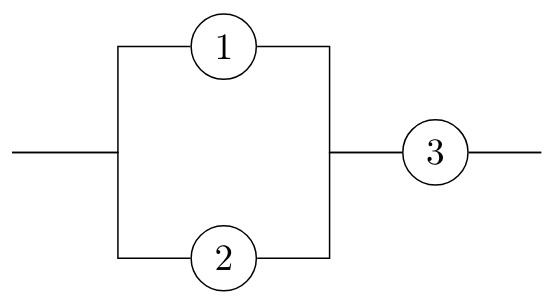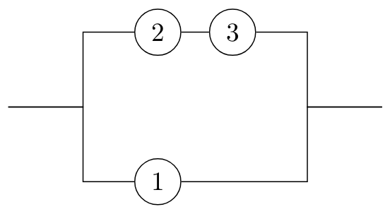 Exercise 5.1 The diagrams below represent systems with components that fail independently: the probability that component \(i\) works is \(p_i \in [0,1]\). For each system: i. find the probability that the system works, as a function of \(p_1\), \(p_2\), and \(p_3\); ii. find the probability that the system works in case \(p_1 = p_2 = p_3 = 0.7\); iii. find the conditional probability that component \(1\) works, given that the system works, in case \(p_1 =p_2 = p_3 =0.7\).
