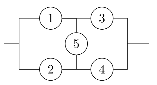 Exercise 5.4 The diagram below represents a system with components that fail independently. Suppose that component \(i\) works with probability \(\mathbb{P} ( W_i ) = p_i\). Find the probability that the system works as a function of \(p_1, \ldots, p_5\).