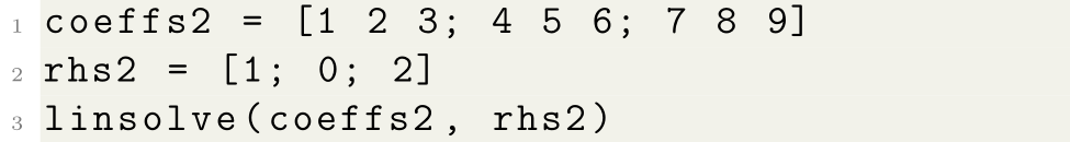 In this topic, we’ll learn how the computer found this solution (a method called Gaussian elimination). It’s important to understand the basics of what is happening “under the hood” because it doesn’t always work as smoothly as this. Consider the equations \[\begin{align*} x + 2y + 3z &= 1, \\ 4x + 5y + 6z &= 0, \\ 7x + 8y + 9z &= 2. \end{align*}\] If we try to solve this system in MATLAB as before, typing