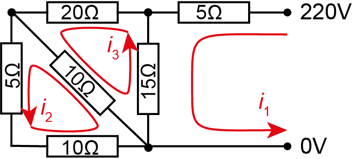 Kirchoff’s law tells us that the sum of voltage drops is equal to the sum of voltage sources around any loop. Applying it to the three loops shown, along with Ohm’s law for each resistor, gives the simultaneous equations \[\begin{align*} 5i_1 + 15(i_1 - i_3) &= 220, \\ 10(i_2 - i_3) + 5i_2 + 10i_2 &= 0, \\ 20i_3 + 10(i_3-i_2) + 15(i_3-i_1) &= 0. \end{align*}\] Simplifying, we get our original system \[\begin{align*} 20i_1 \qquad\;\;\,- 15i_3 &= 220, \\ 25i_2 - 10i_3 &= 0, \\ -15i_1 - 10i_2 + 45i_3 &= 0. \end{align*}\]