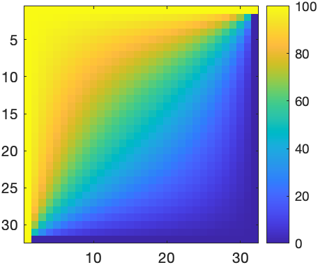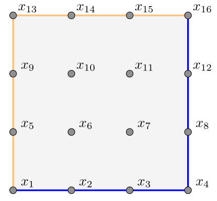 Example 1.2. In studying a steady state temperature in a square with top and left sides held at \(100^\circ\)C and bottom and right at \(0^\circ\)C, a typical numerical approach is to divide into a discrete grid of points. For example, taking \(N=16\) points \(x_1,\ldots, x_{16}\):