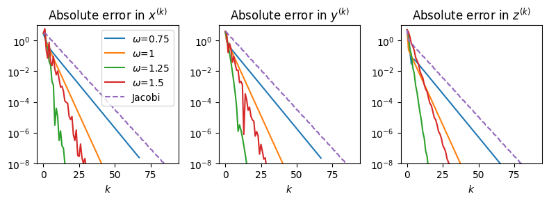 z^{(k+1)} &= (1-\omega)z^{(k)} + \omega\left(\frac{-24+y^{(k+1)}}{4}\right).