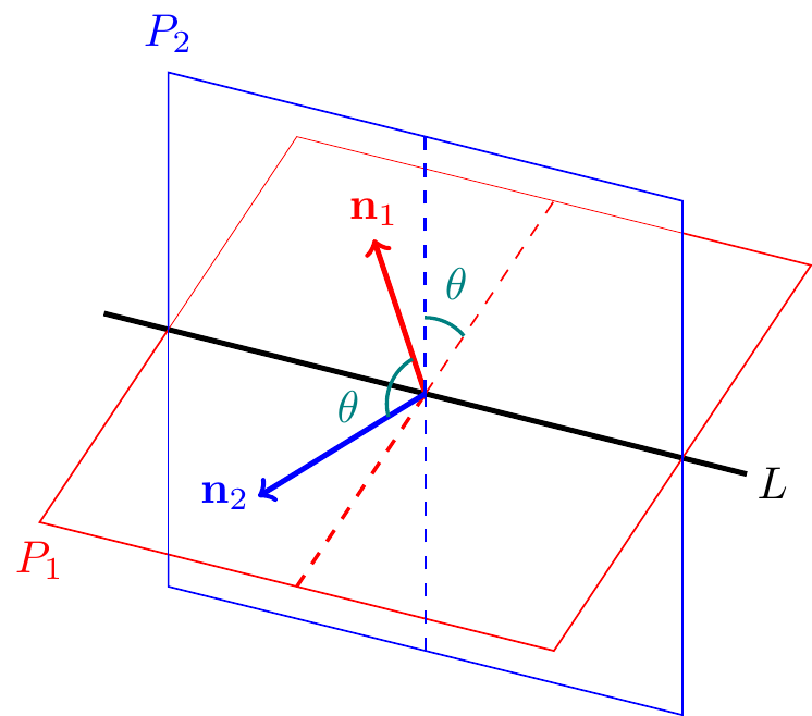 Example 3.7. Find the angle between the vectors \[{\bf u}=\begin{pmatrix} 1 \\ 1 \\ 1 \end{pmatrix} = {\bf i} + {\bf j} + {\bf k} \quad\text{and}\quad {\bf v}=\begin{pmatrix} 2 \\ 0 \\ -3 \end{pmatrix} = 2{\bf i} - 3{\bf k}. \] We have \[\begin{align*} {\bf u}\cdot{\bf v} &= 1(2) + 1(0) + 1(-3) = -1,\\ |{\bf u}| &= \sqrt{1^2 + 1^2 + 1^2} = \sqrt{3},\\ |{\bf v}| &= \sqrt{2^2 + 0^2 + (-3)^2} = \sqrt{13}, \end{align*}\] so \[ \cos\theta = \frac{{\bf u}\cdot{\bf v}}{|{\bf u}|\,|{\bf v}|} = \frac{-1}{\sqrt{3}\sqrt{13}} \quad \implies \theta=\arccos\left(\frac{-1}{\sqrt{39}}\right). \]