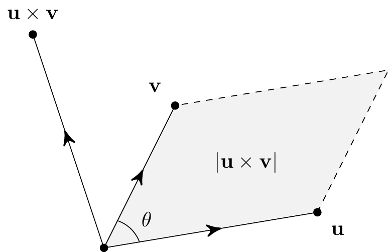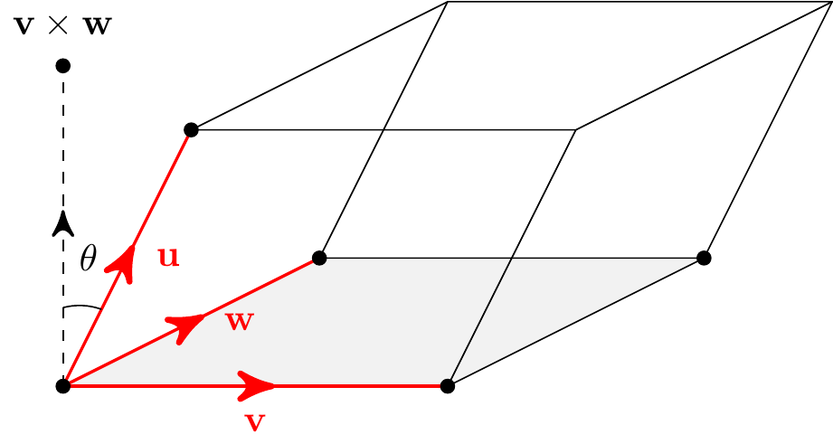 To see why this is, note that the volume is the area of the base times the height. We know that the area of the base is \(|{\bf v}\times{\bf w}|\). The vector \({\bf n}={\bf v}\times{\bf w}\) is normal to the base. If it makes an angle \(\theta\) with \({\bf u}\) then the height of the parallelepiped is \(|{\bf u}|\cos\theta\). So the volume is \[ |{\bf v}\times{\bf w}|\,|{\bf u}|\cos\theta = {\bf u}\cdot({\bf v}\times{\bf w}). \]