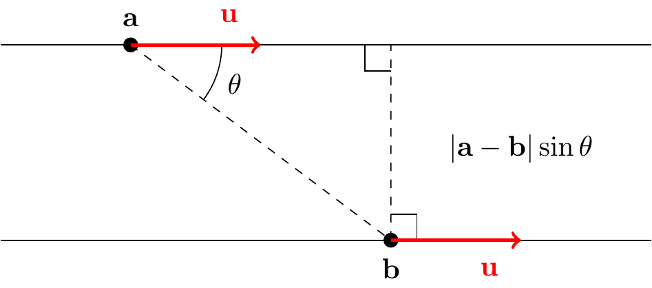 The first four properties follow readily from the definition. The last property is a special case of the important formula \[ {\bf u}\cdot{\bf v} = |{\bf u}|\,|{\bf v}|\cos\theta \] where \(\theta\) is the angle between \({\bf u}\) and \({\bf v}\). We can prove it using the cosine law: this is a generalisation of Pythagoras’s Theorem to non-right-angled triangles.