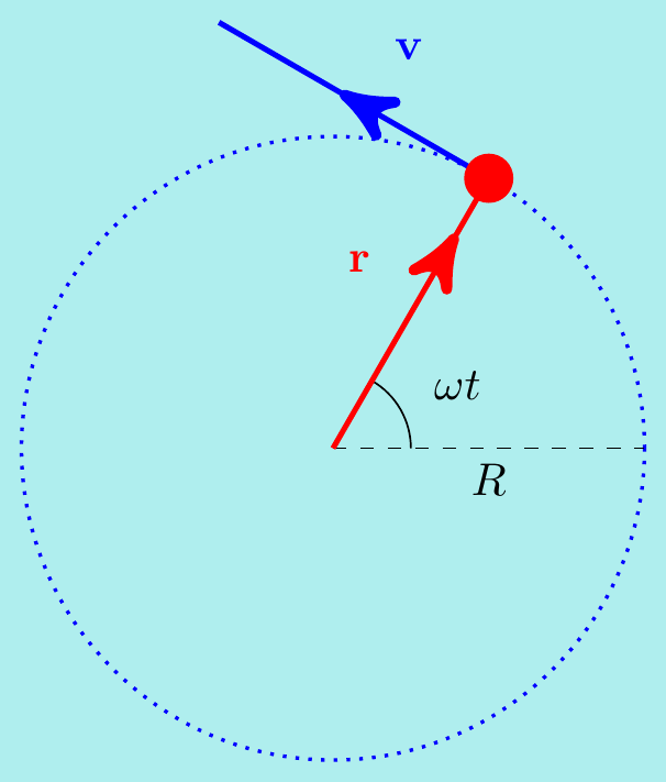 Example 3.23. A particle of mass \(m\) moves with position vector \[ {\bf r}(t) = \begin{pmatrix} x(t) \\ y(t) \\ 0 \end{pmatrix} = \begin{pmatrix} R\cos(\omega t) \\ R\sin(\omega t) \\ 0 \end{pmatrix} \] for some constants \(R\) and \(\omega\). Show that the particle moves in a circle, find the force acting on the particle, and show its angular momentum is conserved.