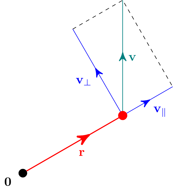 We can also see that the angular momentum only arises from the perpendicular component of the velocity by decomposing the velocity as \({\bf v} = {\bf v}_\parallel + {\bf v}_\perp\), where \({\bf v}_\parallel\) is parallel to the position vector \({\bf r}\) and \({\bf v}_\perp\) is perpendicular to \({\bf r}\):