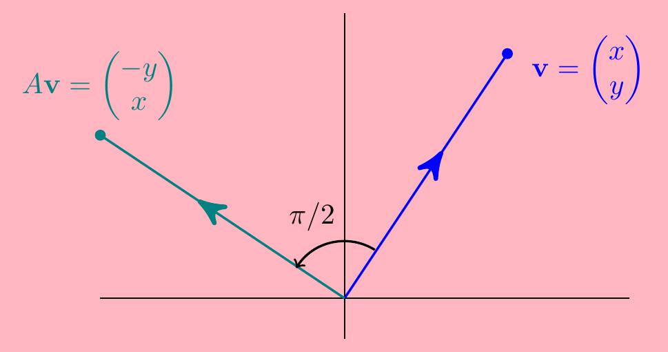Remark. Consider the matrix \(A=\begin{pmatrix} 0 & -1 \\ 1 & 0 \end{pmatrix}\) mapping \(\;\;\begin{pmatrix} x \\ y \end{pmatrix}\longmapsto \begin{pmatrix} 0 & -1 \\ 1 & 0 \end{pmatrix} \begin{pmatrix} x \\ y \end{pmatrix} =\begin{pmatrix} -y \\ x \end{pmatrix}\).