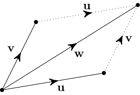 With two vectors \({\bf u}\) and \({\bf v}\), the sum \({\bf w} = {\bf u} + {\bf v}\) is the path to the corner of the parallelogram formed from \({\bf u}\) and \({\bf v}\):