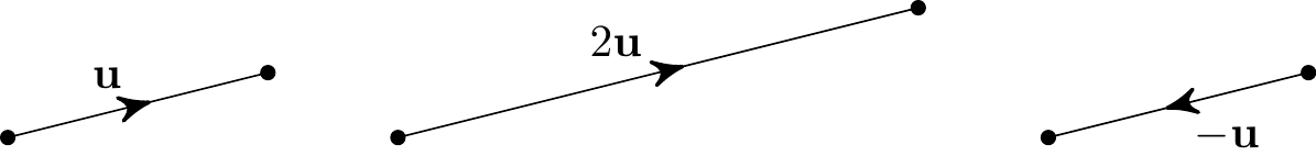Scalar multiplication. \(\;\) We can multiply a vector \({\bf u}\) by a \(\lambda\in\mathbb{R}\) to give a new vector \(\lambda{\bf u}\). This is in the same direction as \({\bf u}\) for \(\lambda > 0\) and in the opposite direction if \(\lambda <0\), and the length is scaled by \(|\lambda|\), so \[ |\lambda{\bf u}| = |\lambda|\,|{\bf u}|. \]