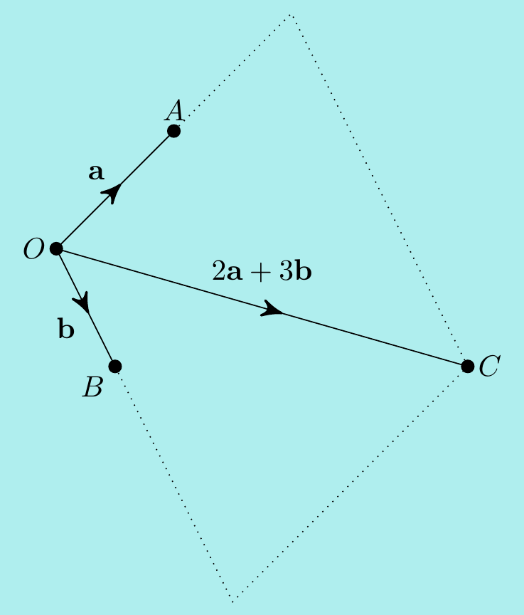 Adding two vectors just corresponds to adding the coordinates: \[ \begin{pmatrix} 3 \\ 2 \end{pmatrix} + \begin{pmatrix} 1 \\ -1 \end{pmatrix} = \begin{pmatrix} 4 \\ 1 \end{pmatrix}\] or in terms of the standard basis vectors \(\left(3{\bf i} + 2{\bf j}\right) + \left({\bf i}-{\bf j}\right)= 4{\bf i} + {\bf j}\).