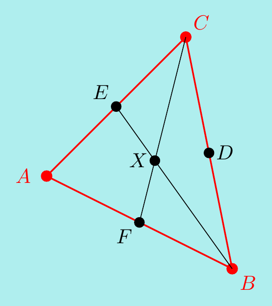 Let \({\bf u}=\overrightarrow{AB}\) and \({\bf v}=\overrightarrow{AC}\). Then \(\overrightarrow{BC}={\bf v}-{\bf u}\) and the three lines have vectors \[\begin{align*} \overrightarrow{AD}&=\overrightarrow{AB}+\frac12\overrightarrow{BC} ={\bf u}+\frac12({\bf v}-{\bf u})=\frac12{\bf v}+\frac12{\bf u}, \\ \overrightarrow{BE}&=\overrightarrow{BA}+\frac12\overrightarrow{AC} =-{\bf u}+\frac12{\bf v}, \\ \overrightarrow{CF}&=\overrightarrow{CA}+\frac12\overrightarrow{AB} =-{\bf v}+\frac12{\bf u}. \end{align*}\] We will now express \(\overrightarrow{AX}\) in two ways. Notice \(\overrightarrow{BX}=\lambda\overrightarrow{BE}\) and \(\overrightarrow{CX}=\mu\overrightarrow{CF}\) for some \(\mu,\lambda\). Thus \[\begin{align*} \overrightarrow{AX} =\overrightarrow{AB}+\overrightarrow{BX} &=\overrightarrow{AB}+\lambda\overrightarrow{BE}\\ &={\bf u}+\lambda\left(-{\bf u}+\frac12{\bf v}\right) =(1-\lambda){\bf u}+\frac12\lambda{\bf v}. \end{align*}\] Similarly, \[\begin{align*} \overrightarrow{AX} =\overrightarrow{AC}+\overrightarrow{CX} &=\overrightarrow{AC}+\mu\overrightarrow{CF}\\ &={\bf v}+\mu\left(-{\bf v}+\frac12{\bf u}\right) =(1-\mu){\bf v}+\frac12\mu{\bf u}. \end{align*}\] Equating these gives \[\begin{align*} (1-\lambda){\bf u}+\frac12\lambda{\bf v} &=(1-\mu){\bf v}+\frac12\mu{\bf u}\\ \implies\quad \left(1-\lambda-\frac12\mu\right){\bf u} &=\left(1-\mu-\frac12\lambda\right){\bf v}. \end{align*}\] However, \({\bf u}\) and \({\bf v}\) are not parallel (if they were, the triangle would collapse into a line and the question would be much easier). So the above equation must say \(0{\bf u}=0{\bf v}\) and \[ \left\{\begin{matrix} 1-\lambda-\frac12\mu = 0 \\[5pt] 1-\mu-\frac12\lambda = 0 \end{matrix}\right. \quad\implies \lambda=\mu=\frac23. \] In particular, \(\overrightarrow{BX}=\dfrac23\overrightarrow{BE}\) and \(\overrightarrow{CX}=\dfrac23\overrightarrow{CF}\).