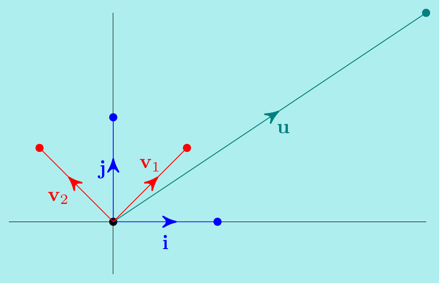 Example 3.6. Show that the vectors \({\bf v}_1=\begin{pmatrix} \frac{1}{\sqrt{2}} \\ \frac{1}{\sqrt{2}} \end{pmatrix}\) and \({\bf v}_2=\begin{pmatrix} -\frac{1}{\sqrt{2}} \\ \frac{1}{\sqrt{2}} \end{pmatrix}\) form a basis for \(\mathbb{R}^2\), and find the coordinates of \({\bf u}=\begin{pmatrix} 3 \\ 2 \end{pmatrix}\) with respect to this basis.