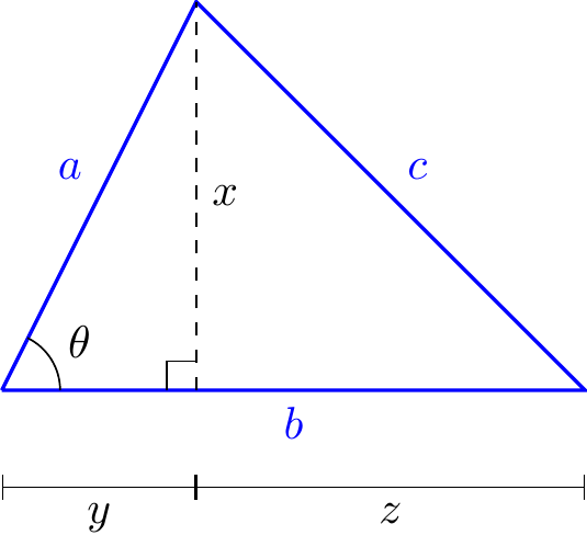 Suppose a triangle has side lengths \(a\), \(b\), \(c\) and angle \(\theta\) as shown.