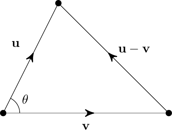 It has side lengths \(a=|{\bf u}|\), \(b=|{\bf v}|\) and \(c=|{\bf u}-{\bf v}|\), so using the cosine law, we get \[|{\bf u}-{\bf v}|^2=|{\bf u}|^2+|{\bf v}|^2-2|{\bf u}|\,|{\bf v}|\cos\theta.\] Also, using the properties of the scalar product, \[\begin{align*} |{\bf u}-{\bf v}|^2 &= \left({\bf u}-{\bf v}\right)\cdot\left({\bf u}-{\bf v}\right) \\ &= {\bf u}\cdot{\bf u}+{\bf v}\cdot{\bf v}-{\bf u}\cdot{\bf v}-{\bf v}\cdot{\bf u} \\ &= |{\bf u}|^2+|{\bf v}|^2-2{\bf u}\cdot{\bf v}. \end{align*}\] Comparing these two formulas gives \({\bf u}\cdot{\bf v} = |{\bf u}|\,|{\bf v}|\cos\theta\).