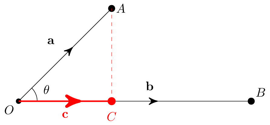 Then the projection of \({\bf a}\) onto \({\bf b}\) is the vector \({\bf c}=\overrightarrow{OC}\). Its length \(|\overrightarrow{OC}|\) is the component of \({\bf a}\) in the direction of \({\bf b}\), and is given by \[ |\overrightarrow{OC}| = |{\bf a}|\cos\theta = |{\bf a}|\frac{{\bf a}\cdot{\bf b}}{|{\bf a}|\,|{\bf b}|} = \frac{{\bf a}\cdot{\bf b}}{|{\bf b}|}. \]