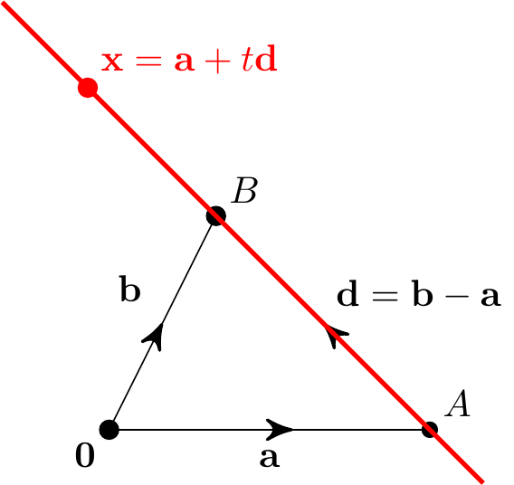 Example 3.1. If the position vectors of \(A\), \(B\) and \(C\) are \({\bf a}\), \({\bf b}\) and \(2{\bf a} + 3{\bf b}\) respectively, what are \(\overrightarrow{AB}\), \(\overrightarrow{BC}\) and \(\overrightarrow{CA}\)? \[\begin{align*} \overrightarrow{AB}&=\overrightarrow{AO}+\overrightarrow{OB}= \overrightarrow{OB}-\overrightarrow{OA}={\bf b}-{\bf a} \\ \overrightarrow{BC}&=\overrightarrow{OC}-\overrightarrow{OB}= 2{\bf a}+3{\bf b}-{\bf b}=2{\bf a}+2{\bf b} \\ \overrightarrow{CA}&=\overrightarrow{OA}-\overrightarrow{OC}= {\bf a}-(2{\bf a}+3{\bf b})=-{\bf a}-3{\bf b} \end{align*}\]