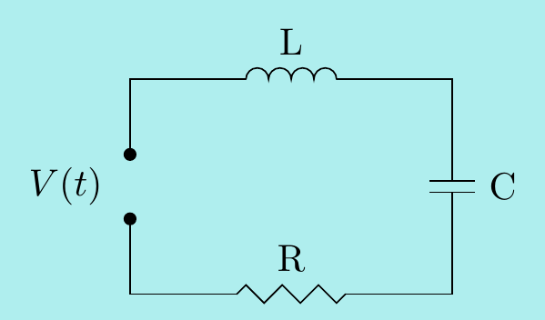 \((3)\;\) Electrical circuits:\(\;\) Recall an RLC circuit is a combination of resistors, inductors and capacitors. A time-varying voltage source \(V(t)\) is placed across a series circuit consisting of a resistor \(R\), an inductor \(L\) and a capacitor \(C\) (all measured in suitable units).