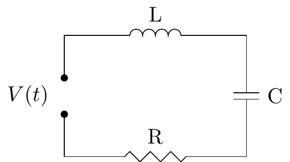The current \(I(t)\) at time \(t\) in the circuit satisfies a differential equation: \[L\dfrac{d^2I}{dt^2}+R\dfrac{dI}{dt}+\dfrac{I}{C}=\dfrac{dV}{dt}\]