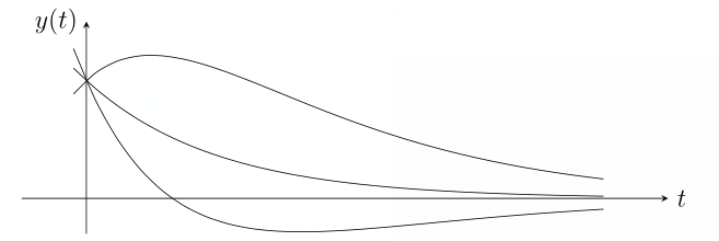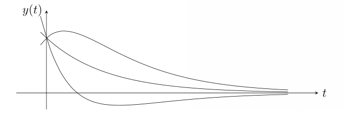 Overdamping (\(\zeta>1\))\(\;\) The roots \(\lambda_1=-\zeta\omega_0+\omega_0\sqrt{\zeta^2-1}\) and \(\lambda_2=-\zeta\omega_0-\omega_0\sqrt{\zeta^2-1}\) are distinct and real so the general solution is given by \[y(t)=Ae^{\lambda_1t}+Be^{\lambda_2t}.\] Notice that \(\lambda_2<\lambda_1<0\) as the parameters \(\omega_0\), \(\zeta\) are positive and \(\zeta=\sqrt{\zeta^2}>\sqrt{\zeta^2-1}\). Hence \(y(t)\) is a sum of two decaying exponential terms and the motion rapidly decreases to zero. The following graph displays a few solutions with \(y(0)\) fixed and various \(y'(0)\).