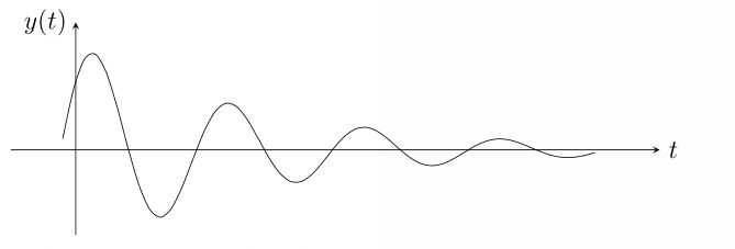 Underdamping (\(0\leq\zeta<1\)) \(\;\) In this case, the two roots \(\lambda_1=-\zeta\omega_0+\omega_0\sqrt{\zeta^2-1}\) and \(\lambda_2=-\zeta\omega_0-\omega_0\sqrt{\zeta^2-1}\) are complex conjugates. In fact, if we write \(\omega=\omega_0\sqrt{1-\zeta^2}\), then these two roots are \[\lambda_1,\lambda_2=-\zeta\omega_0\pm i\omega.\] Hence the general solution is given by \[y(t)=e^{-\zeta\omega_0 t}\left(A\cos{\omega t}+B\sin{\omega t}\right).\] This time, the solution consists of a decaying exponential term multiplied by a trigonometric term which oscillates with frequency \(\omega\) (the actual frequency).