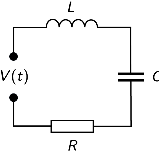 Example 2.21 \(\,\) For the following “series RLC circuit” with current \(I=I_0\cos(\omega t)\), find the value of \(\omega\) which minimises the magnitude of the total impedance. Also, find the phase difference between the current and voltage in terms of \(\omega\).