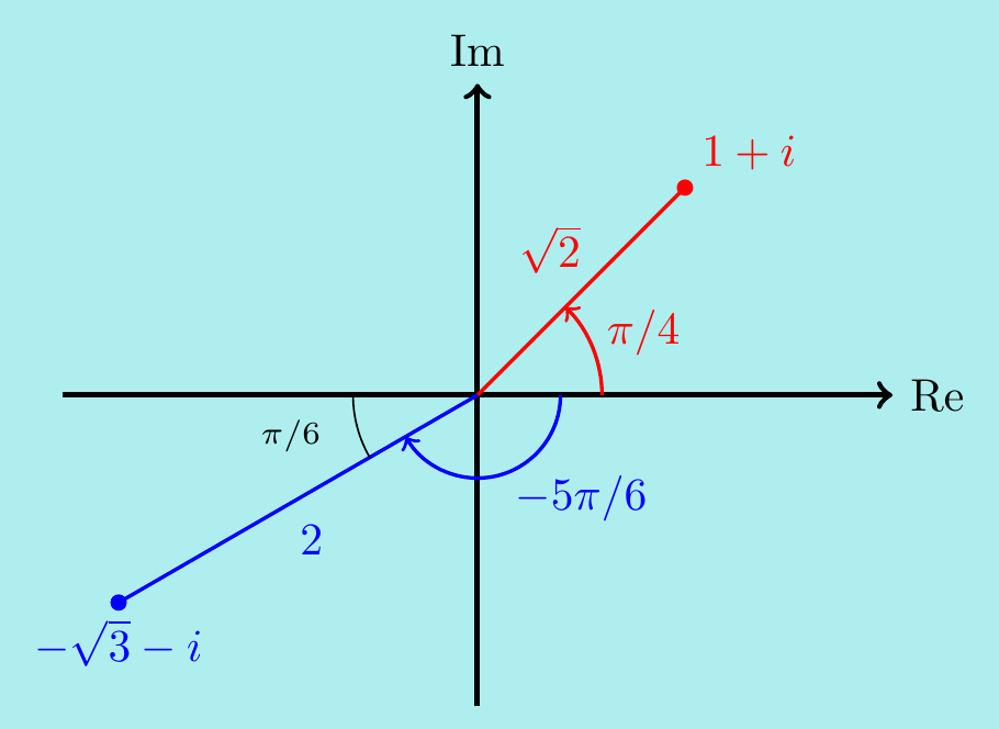Example 2.4 \(\,\)Find the moduli and principal arguments of \(1+i\) and \(-\sqrt{3}-i\).