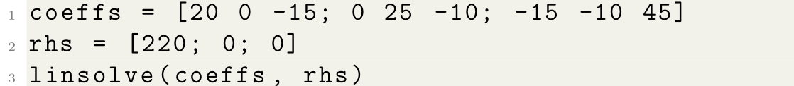 In engineering and science, we often need to solve simultaneous equations like \[\begin{align*} 20x \qquad\;\;\, - 15z &= 220, \\ 25y - 10z &= 0, \\ -15x - 10y + 45z &= 0. \end{align*}\] This a system of linear equations, where “linear” means they only involve first powers of the variables (so constant multiples of \(x\), \(y\) and \(z\) but nothing like \(x^2\) or \(\sin{z}\)). By “solve”, we mean find values for \(x\), \(y\) and \(z\) that satisfy all the equations simultaneously. Linear Algebra begins with the study of systems like this. Here is an example of a problem that would give rise to the equations above.