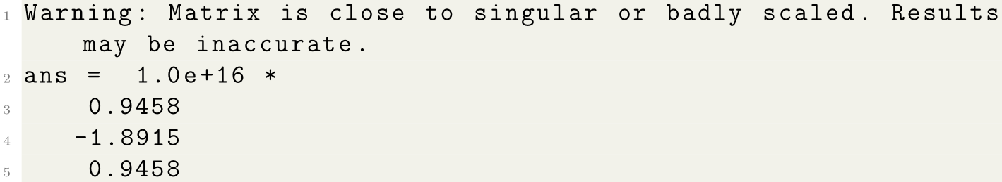 Thus with the above ill-conditioned matrix, when solving \(A{\bf x} = {\bf b}\) using \({\bf x} = A^{-1}{\bf b}\), we are multiplying \({\bf b}\) by a matrix with large determinant \(\det(A^{-1})= 27429\). So a small change in \({\bf b}\) leads to a large change in \({\bf x}=A^{-1}{\bf b}\).