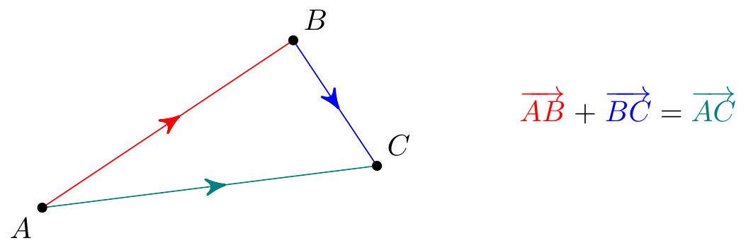 Vector addition. \(\;\) We add vectors “head to tail”. Thus we always have
