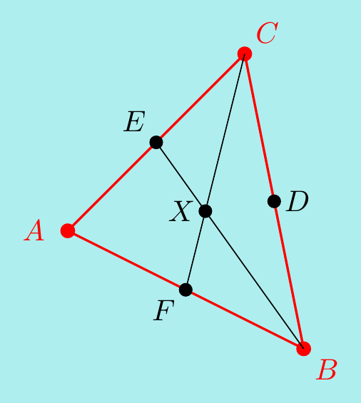 Let \({\bf u}=\overrightarrow{AB}\) and \({\bf v}=\overrightarrow{AC}\). Then \(\overrightarrow{BC}={\bf v}-{\bf u}\) and the three lines have vectors \[\begin{align*} \overrightarrow{AD}&=\overrightarrow{AB}+\frac12\overrightarrow{BC} ={\bf u}+\frac12({\bf v}-{\bf u})=\frac12{\bf v}+\frac12{\bf u}, \\ \overrightarrow{BE}&=\overrightarrow{BA}+\frac12\overrightarrow{AC} =-{\bf u}+\frac12{\bf v}, \\ \overrightarrow{CF}&=\overrightarrow{CA}+\frac12\overrightarrow{AB} =-{\bf v}+\frac12{\bf u}. \end{align*}\] We will now express \(\overrightarrow{AX}\) in two ways. Notice \(\overrightarrow{BX}=\lambda\overrightarrow{BE}\) and \(\overrightarrow{CX}=\mu\overrightarrow{CF}\) for some \(\mu,\lambda\). Thus \[\begin{align*} \overrightarrow{AX} =\overrightarrow{AB}+\overrightarrow{BX} &=\overrightarrow{AB}+\lambda\overrightarrow{BE}\\ &={\bf u}+\lambda\left(-{\bf u}+\frac12{\bf v}\right) =(1-\lambda){\bf u}+\frac12\lambda{\bf v}. \end{align*}\] Similarly, \[\begin{align*} \overrightarrow{AX} =\overrightarrow{AC}+\overrightarrow{CX} &=\overrightarrow{AC}+\mu\overrightarrow{CF}\\ &={\bf v}+\mu\left(-{\bf v}+\frac12{\bf u}\right) =(1-\mu){\bf v}+\frac12\mu{\bf u}. \end{align*}\] Equating these gives \[\begin{align*} (1-\lambda){\bf u}+\frac12\lambda{\bf v} &=(1-\mu){\bf v}+\frac12\mu{\bf u}\\ \implies\quad \left(1-\lambda-\frac12\mu\right){\bf u} &=\left(1-\mu-\frac12\lambda\right){\bf v}. \end{align*}\] However, \({\bf u}\) and \({\bf v}\) are not parallel (if they were, the triangle would collapse into a line and the question would be much easier). So the above equation must say \(0{\bf u}=0{\bf v}\) and \[ \left\{\begin{matrix} 1-\lambda-\frac12\mu = 0 \\[5pt] 1-\mu-\frac12\lambda = 0 \end{matrix}\right. \quad\implies \lambda=\mu=\frac23. \] In particular, \(\overrightarrow{BX}=\dfrac23\overrightarrow{BE}\) and \(\overrightarrow{CX}=\dfrac23\overrightarrow{CF}\).