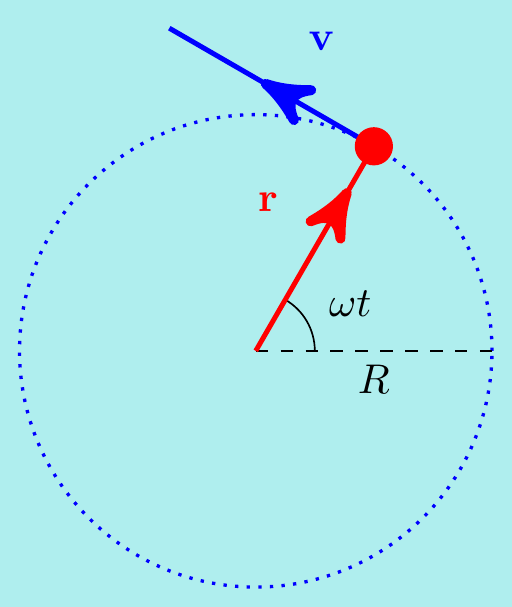 The acceleration is \({\bf a} = \dot{{\bf v}} = \begin{pmatrix} -R\omega^2\cos(\omega t)\\ -R\omega^2\sin(\omega t)\\ 0 \end{pmatrix} = -\omega^2{\bf r}\).