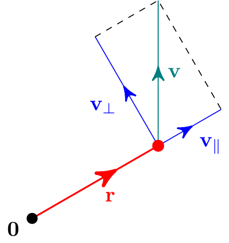 We can also see that the angular momentum only arises from the perpendicular component of the velocity by decomposing the velocity as \({\bf v} = {\bf v}_\parallel + {\bf v}_\perp\), where \({\bf v}_\parallel\) is parallel to the position vector \({\bf r}\) and \({\bf v}_\perp\) is perpendicular to \({\bf r}\):