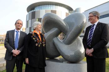 On the afternoon of 14th March, a sculpture in stone by the artist Peter Sales and inspired by a 4-lobed Willmore torus was unveiled on the Science Site of Durham University. After speeches from the Vice Chancellor of Durham University, Prof. Chris Higgins, and Tom's widow, Dr Gillian Boughton, the unveiling itself was performed before a crowd of several hundred people by some of the Willmore Pure Mathematics Postgraduate Fellows. These fellowships are funded from the Willmore Foundation, which was set up by Dr Boughton, and are awarded to promising PhD students working in pure mathematics at Durham University. After the sculpture unveiling, approximately 300 cupcakes (each decorated with a picture of a Willmore surface!) were consumed at a reception held to mark the event. [mpeg video 140MB]