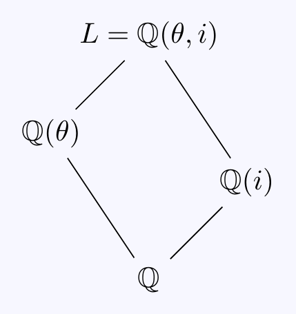 \((b)\) Since \(\mathbb{Q}(\theta)\subset\mathbb{R}\), we have \(i\not\in\mathbb{Q}(\theta)\) so \([L:\mathbb{Q}(\theta)]=2\).