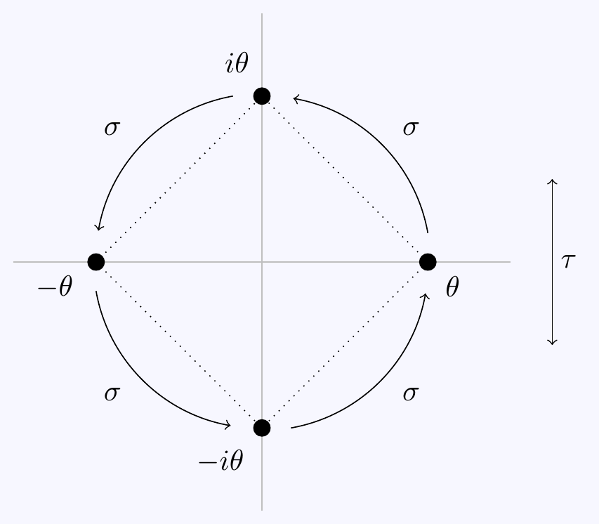 \(\sigma(i)=-i\) and \(\sigma(\theta)=i/\theta\). Notice \(\sigma^2(\theta)=\sigma(i/\theta)=-i/(i/\theta)=-\theta\) and \(\sigma^4(\theta)=\theta\) so we do indeed have \(\langle\,\sigma\,\rangle\cong\mathbb{Z}/4\).