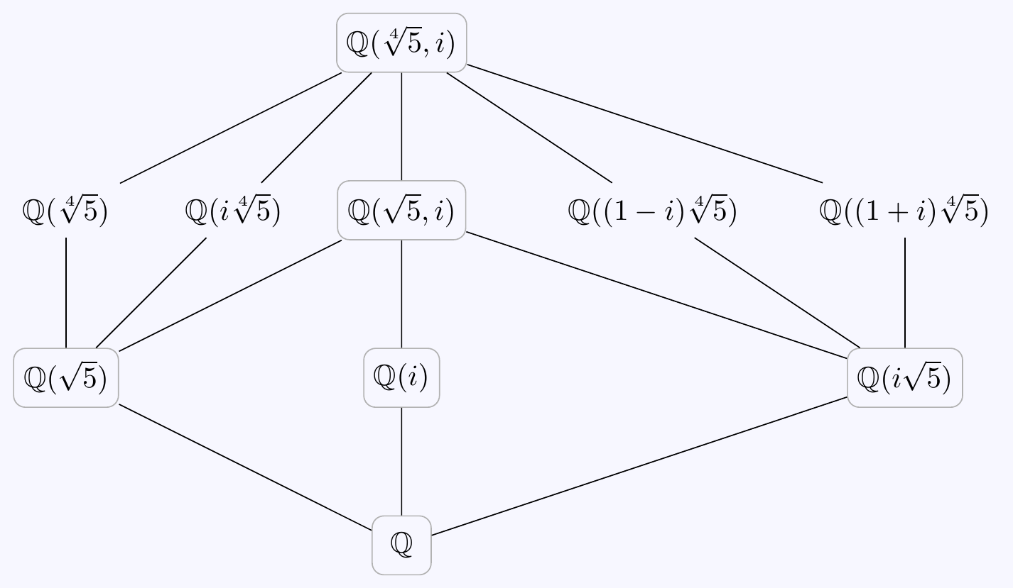 The order \(2\) subgroups correspond to degree \(4\) extensions of \(\mathbb{Q}\) in \(L\). Some of these are easy to find, \[L^{\langle\,\tau\,\rangle}=\mathbb{Q}(\theta),\qquad L^{\langle\,\tau\sigma^2\,\rangle}=\mathbb{Q}(i\theta),\qquad L^{\langle\,\sigma^2\,\rangle}=\mathbb{Q}(\theta^2,i)=\mathbb{Q}(\sqrt{5},i).\] For the remaining subgroups \(\langle\,\tau\sigma\,\rangle\) and \(\langle\,\tau\sigma^3\,\rangle\), it’s less obvious which elements of \(L\) are fixed. Consider how automorphisms in the subgroup act on a general element of \(L\): \[\alpha=a+b\theta+c\theta^2+d\theta^3+ei+fi\theta+gi\theta^2+hi\theta^3 \quad\text{where $a,b,...,h\in\mathbb{Q}$.}\] Applying \(\tau\sigma\) gives \[\tau\sigma(\alpha)=a-bi\theta-c\theta^2+di\theta^3-ei-f\theta+gi\theta^2+h\theta^3 \] so \(\tau\sigma(\alpha)=\alpha\) if and only if \(b=-f\), \(c=-c\), \(e=-e\), \(d=h\), i.e. \[\alpha=a+b(1-i)\theta+d(1+i)\theta^3+gi\theta^2.\] Picking something simple, e.g. \(a=d=g=0\) and \(b=1\) gives a degree \(4\) element \(\beta=(1-i)\theta\) fixed by \(\tau\sigma\). Actually, \(\beta^2=-2i\theta^2\) and \(\beta^3=-2(1+i)\theta^3\), so \[\tau\sigma(\alpha)=\alpha\quad\iff\quad \alpha=a+b\beta-(g/2)\beta^2-(d/2)\beta^3 \quad\text{for arbitrary $a,b,g,d\in\mathbb{Q}$.}\] Hence we have \(L^{\langle\,\tau\sigma\,\rangle}=\mathbb{Q}(\beta)=\mathbb{Q}((1-i)\theta)\). Similarly, \(\gamma=(1+i)\theta\) is fixed by \(\tau\sigma^3\) and we find \(L^{\langle\,\tau\sigma^3\,\rangle}=\mathbb{Q}((1+i)\theta)\). Here’s the full diagram of \(L\) and its subfields, with the normal extensions of \(\mathbb{Q}\) in boxes corresponding to the normal subgroups of \(G\):