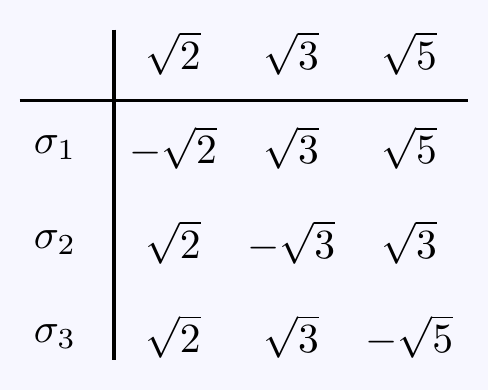 Define an integer \(m=2^{j_1}3^{j_2}5^{j_3}\). Then we also have \[\sigma_i(\sqrt{m})=(-1)^{j_i}\sqrt{m}\qquad\implies\qquad \sigma_i(\sqrt{7m})=\sigma_i(\sqrt{7})\sigma_i(\sqrt{m})=\sqrt{7m}.\]