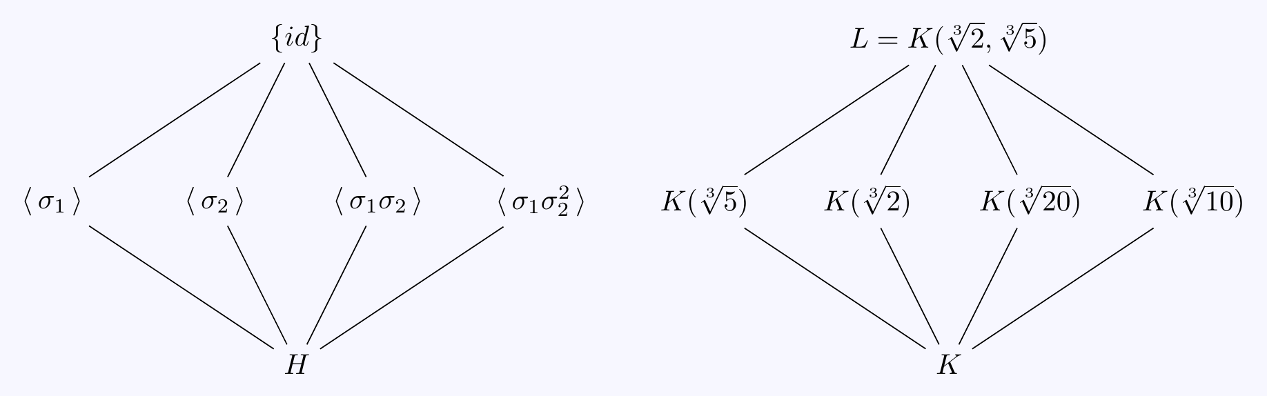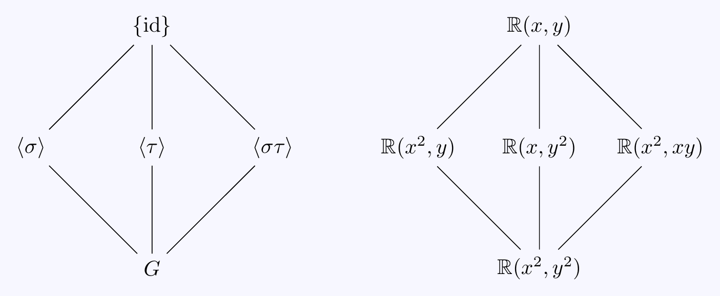 Now \(\sigma^2=\tau^2=\id\) and \(\sigma\tau=\tau\sigma\) so once again, the Galois group is \[G=\{\id,\sigma,\tau,\sigma\tau\}=\langle\,\sigma,\tau\,\rangle\cong\mathbb{Z}/2\times\mathbb{Z}/2.\] The subgroups and corresponding fixed fields are as follows:
