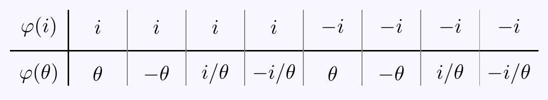 Column 5 is complex conjugation on \(L=\mathbb{Q}(i,\theta)\).The only way to get an order \(4\) element of \(G\) is to choose one of the last two columns (none of the choices with \(\varphi(i)=+i\) or \(\varphi(\theta)=\pm\theta\) work). So define \(\tau\) and \(\sigma\in G\) by