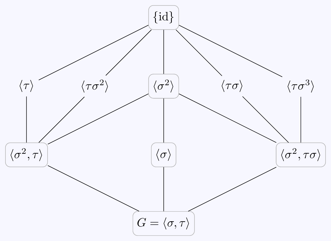 Also, check that \(\sigma\tau=\tau\sigma^3\) and so \(G\) is isomorphic to the dihedral group \(D_4\): \[G=\langle\,\sigma,\tau\,\mid\,\sigma^4=\tau^2=\id,\;\tau^{-1}\sigma\tau=\sigma^{-1}\,\rangle\cong D_4. \]