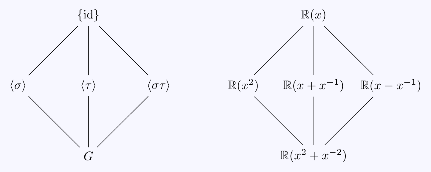 Remark: We can visualise \(G\) as the symmetry group \(D_4\) of a square by plotting the four roots in the complex plane and seeing how they are moved by \(G\). Notice complex conjugation \(\tau\) is a reflection of the whole field \(L\subset\mathbb{C}\), However, the other automorphism \(\sigma\) does not rotate the whole field as, for instance, rational numbers on the real line are not moved by \(\sigma\). It is only rotating the 4 roots…